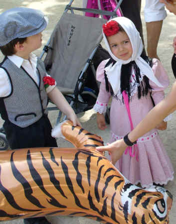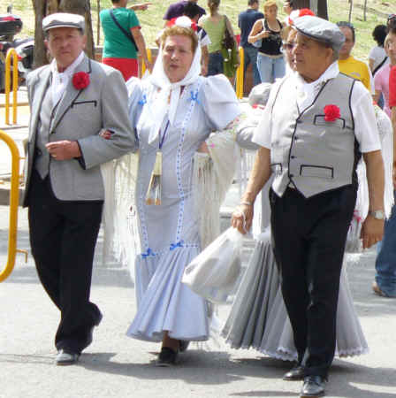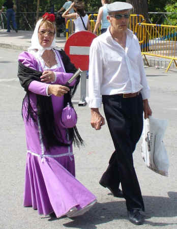 Das ist die Tracht der Castizos. Das sind die Vertreter der madrider Arbeiterklasse. Madrid hat ein sehr selbstbewusstes und sehr präsentes Proletariat. Zur Frauentracht gehört eine rote Nelke im Kopftuch, ein farbenfrohes langes Kleid und eine alfombra (Umhängetuch mit Fransen). Die Männer tragen ein weisses Hemd, schwarze Hosen und eine schwarzweisse Mütze.