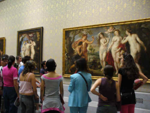 Eine gelangweilte Schulklasse steht vor den fetten Grazien von Rubens.