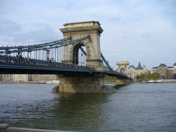 Das Stadtbild der Zwei - Millionen - Metropole wird durch die Donau geprägt, die die Trennlinie zwischen Buda und Pest bildet. Zahlreiche Brücken verbinden die zwei Stadtteile. Hier sieht man die Kettenbrücke (Lánchíd), die berühmteste und älteste Brücke Budapests. Sie wurde 1849 fertiggestellt und galt als eine Meisterleistung der damaligen Ingenieurkunst. Der nicht immer ganz liebevolle deutsche Besatzer hat sie 1945 gesprengt.