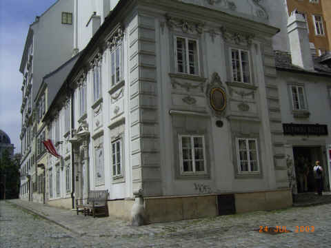 Das ist das Dreimädelhaus. Hier wohnte am Anfang des 19. Jahrhunderts ein Glasermeister mit seinen drei Töchtern Hannerl, Hederl und Heinderl.